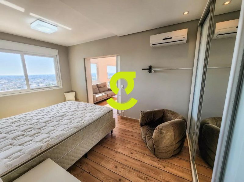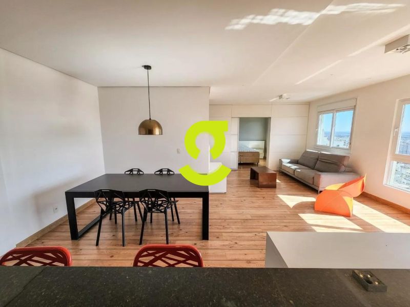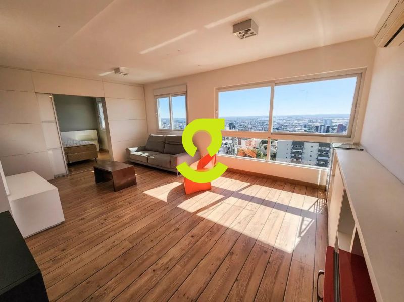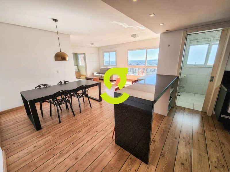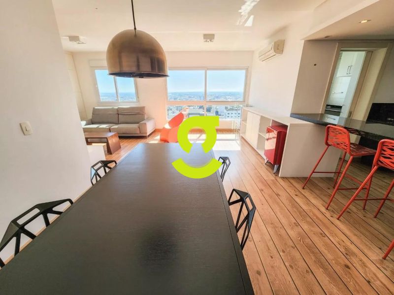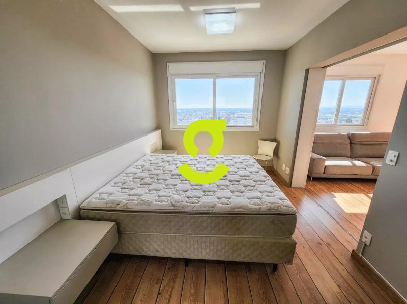 Excelente apartamento, 82m privativos, planta de 2 dormitórios, transformado em 1 dormitório, living estendido para 4 ambientes, semi mobiliado, andar alto, vista espetacular, banheiro social, ar condicionado, cozinha americana montada e com churrasqueira, área de serviço separada com junker e armários. 1 dormitório sendo uma suíte completa com armário, cama e ar condicionado. 2 vagas de garagem. Condomínio com infra estrutura completa de lazer, com portaria 24hs, salão de festa, playground, piscina, academia, brinquedoteca e elevador.
