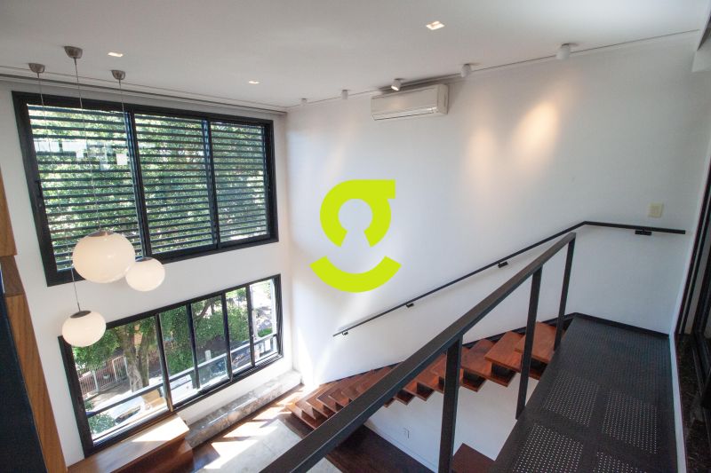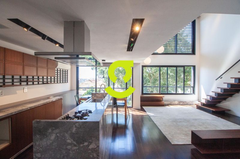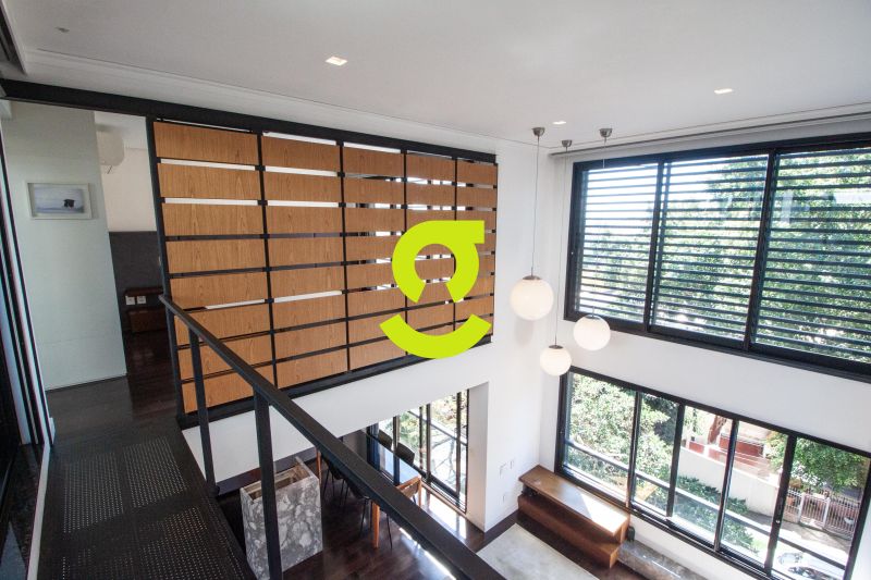 * **Living com pé-direito duplo**, iluminado por janelões que criam um espetáculo de luz natural;