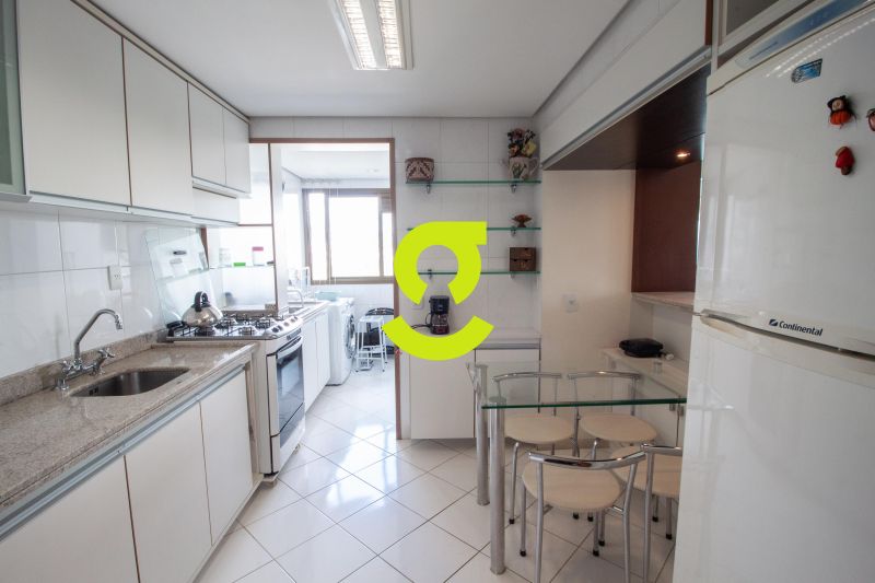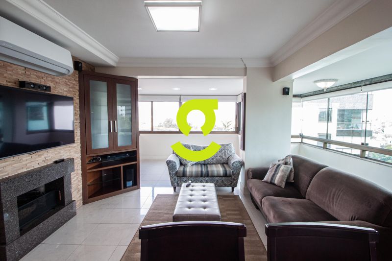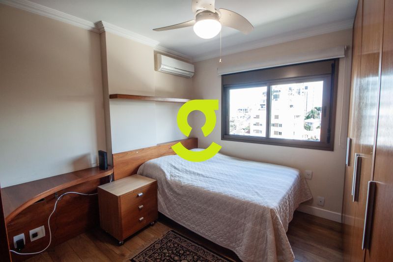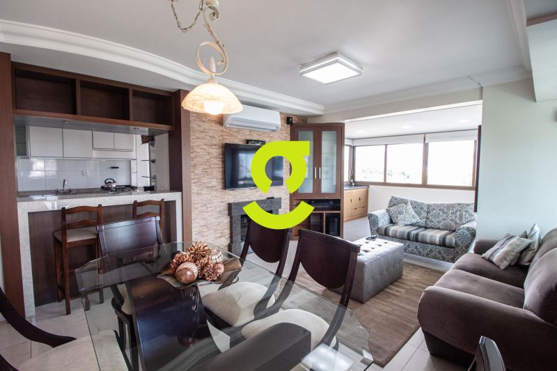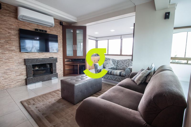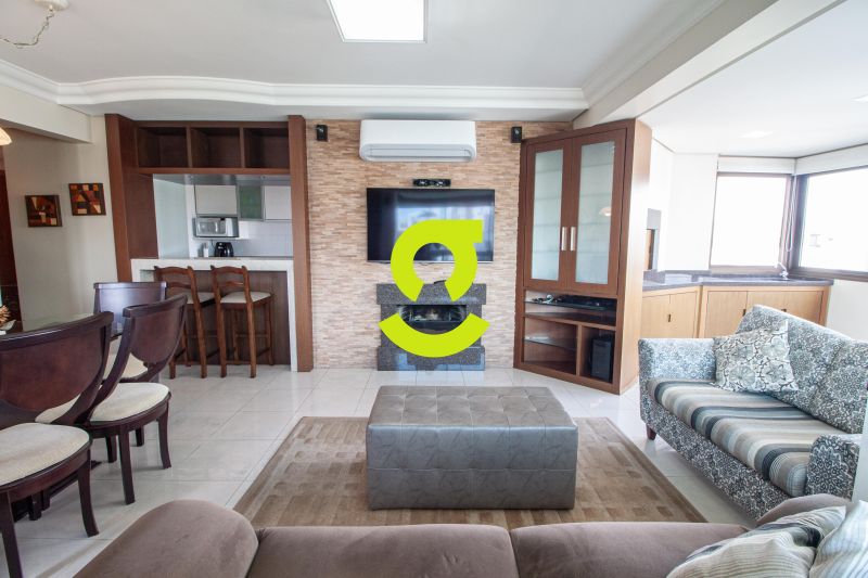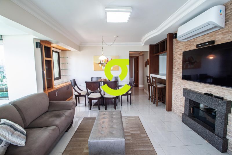Excelente apartamento MOBILIADO ou semi, 124m privativos, posição frente e fundos, living 3 ambientes com ar condicionado, lareira, sacada com churrasqueira, lavabo, cozinha montada, área de serviço separada, 3 dormitórios, todos com armários e ar condicionado, sendo uma suíte com closet. QUATRO vagas de garagem individuais e cobertas.